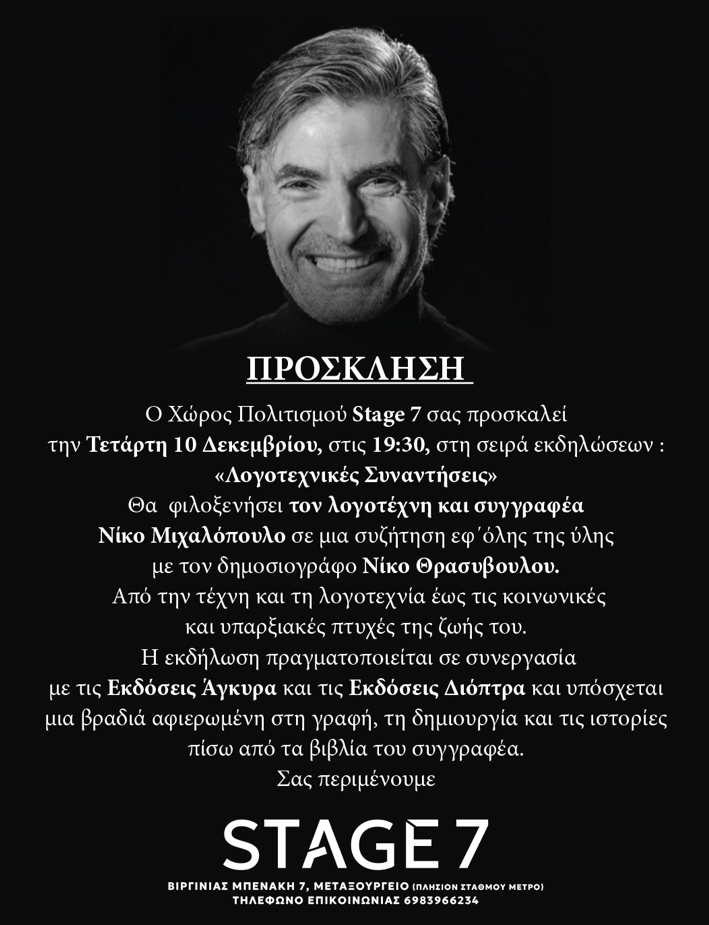 ΤΕΤΑΡΤΗ 10 ΔΕΚΕΜΒΡΙΟΥ 2025 Τα Αθηναϊκά Θέατρα μετά τους κορυφαίους λογοτέχνες μας, Τίτο Πατρίκιο, Γιώργο Χρονά, Γιάννη Ξανθούλη και Χρήστο Χωμενίδη, ανεβάζουν τον συγγραφέα Νίκο Μιχαλόπουλο στη σκηνή του STAGE 7, για μια διαφορετική «ΛΟΓΟΤΕΧΝΙΚΗ ΣΥΝΑΝΤΗΣΗ», με κουβέντα για τέχνη, λογοτεχνία και τις υπαρξιακές και κοινωνικές ανησυχίες του συγγραφέα και αθλητή σε μια πολύ όμορφη ατμόσφαιρα, λίγες μέρες πριν τα Χριστούγεννα, με συντονιστή τον δημοσιογράφο, Νίκο...