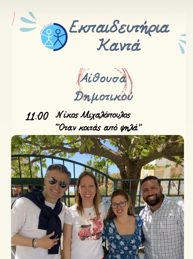 ΚΥΡΙΑΚΗ 26 ΑΠΡΙΛΙΟΥ 2026 Την 3η τους Γιορτή Βιβλίου διοργάνωσαν τα Εκπαιδευτήρια Καντά στα Βριλήσσια, με καλεσμένο τον συγγραφέα, Νίκο Μιχαλόπουλο και το νέο του best seller «ΟΤΑΝ ΚΟΙΤΑΣ ΑΠΟ ΨΗΛΑ», στο οποίο ο Νίκος Μιχαλόπουλος γίνεται η φωνή του Ολυμπιονίκη μας, Εμμανουήλ Καραλή, γράφοντας μια ιστορία που δεν δημιουργήθηκε για να εντυπωσιάσει, αλλά για να δείξει πως μπορείς να κρατήσεις ζωντανή τη φλόγα μέσα σου,...